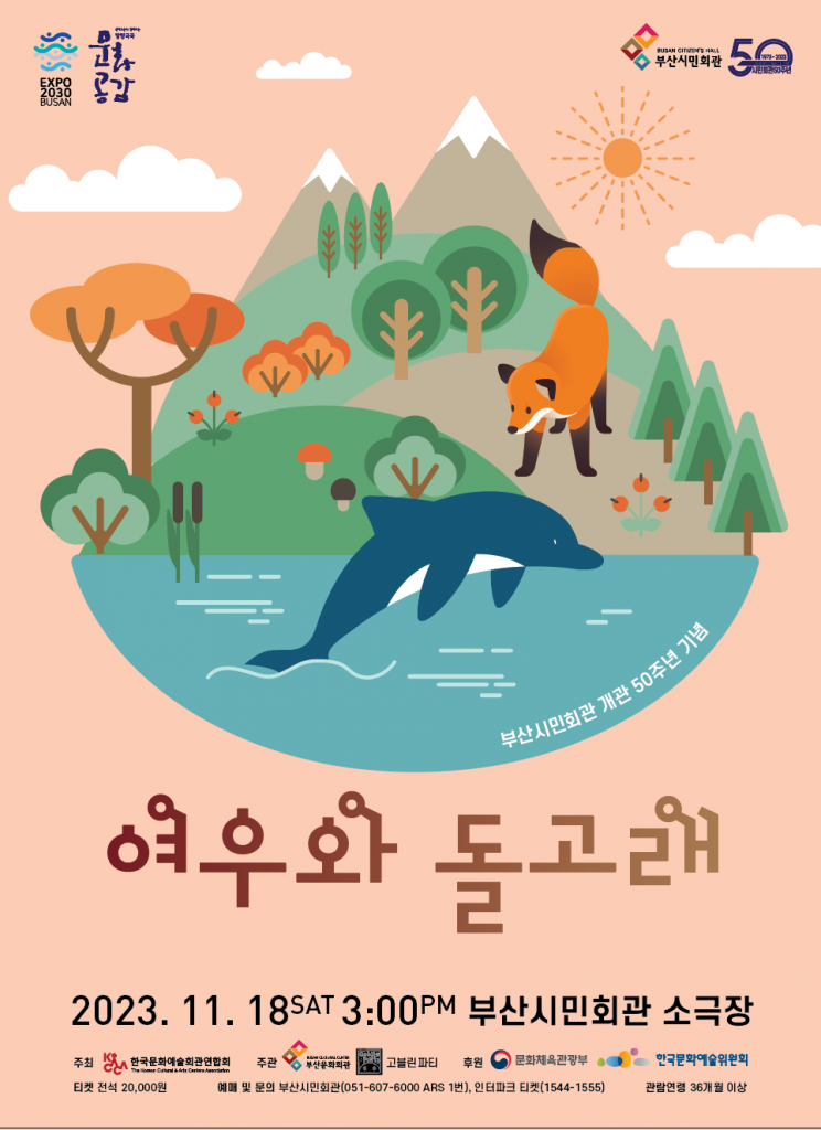 (재)부산문화회관(대표 이정필)은 부산시민회관 개관 50주년을 기념하여 가족을 위한 무용동화극 <여우와 돌고래>를 오는 11월 18일(토) 15시 부산시민회관 소극장에 올린다.