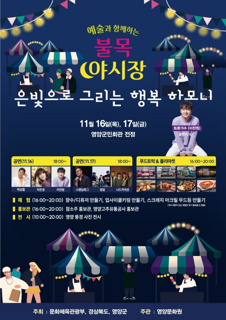 영양군(군수 오도창)은 11월 16일(목)부터 17일(금)까지 이틀간 영양문화원(원장 김경종)이 주최하고 문화체육관광부, 경상북도, 영양군(군수 오도창)이 후원하는 예술과 함께하는 불목 야시장을 “은빛으로 그리는 행복 하모니”라는 부제로 영양군민회관 전정에서 개최한다.