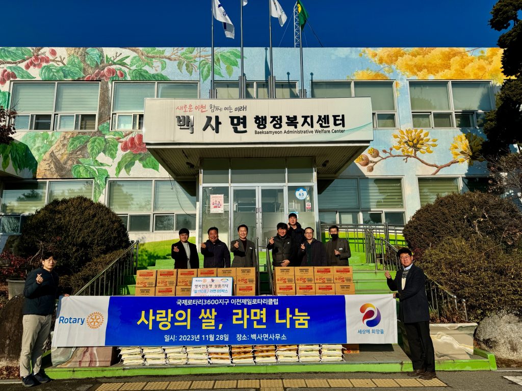 이천제일로타리클럽(회장 김명진)은 백사면 관내 취약계층을 위해 써달라며 백미 110포(1100kg) 및 라면 85박스를 백사면에 기탁하였다.
