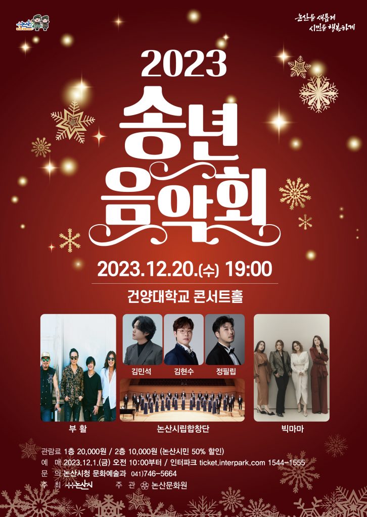 올해 송년음악회에는 인기가수 빅마마ㆍ부활은 물론 음악예능 프로그램 ‘팬텀싱어’(JTBC) 출신 김민석ㆍ김현수ㆍ정필립 등 성악가들과 논산시립합창단이 출연한다.