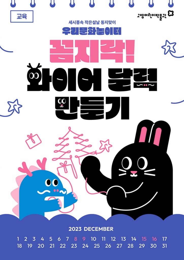 고양특례시(시장 이동환) 고양어린이박물관(관장 조현영)이 오는 12월 8일(금)부터 16일(토)까지 매주 금·토요일에 판소리와 달력을 주제로 한 연말 시즌 교육 ‘우리문화놀이터’를 진행한다.