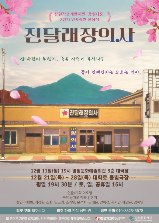 강원문화재단(대표이사 신현상) 「2023 강원작품개발지원사업」의 일환으로 제작된 이호영 연출가의 연극‘진달래장의사’가 12월 11일 영월문화예술회관, 12월 21일~28일까지 서울 대학로 물빛극장에서 관객을 맞이한다.
