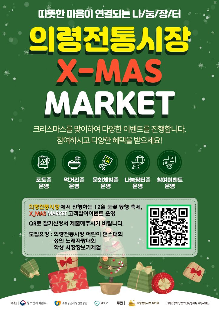 의령전통시장에서는 크리스마스 분위기를 만끽할 수 있도록 시장 내 경관조명과 장식물을 설치하고, 따뜻한 마음이 연결되는 나눔장터를 운영해 기부금도 모금한다.