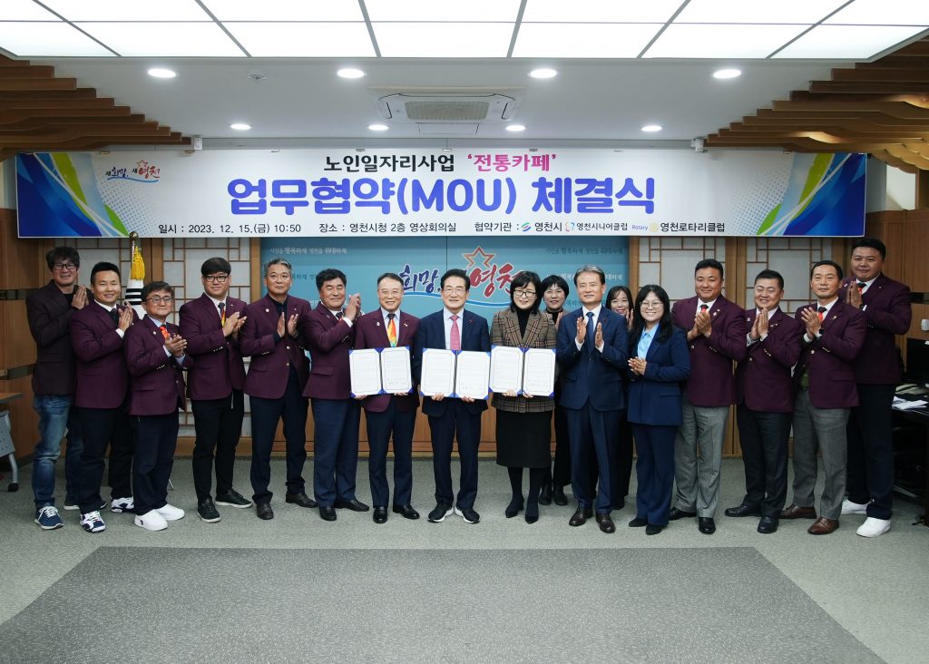 영천시(시장 최기문)·영천시니어클럽(관장 라인선)·영천로타리클럽(회장 강재윤)은 지난 15일 시청 영상회의실에서 노인일자리 창출 및 ‘쌍화별당’ 이라는 전통카페 사업 추진을 위한 업무협약을 체결했다.