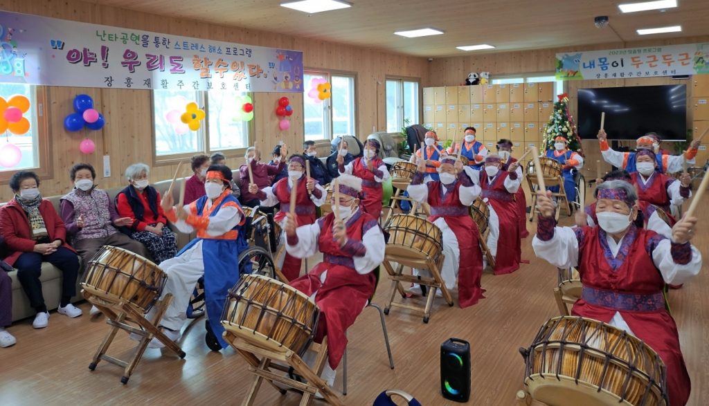 이날은 20여명의 주간보호센터 어르신들이 장흥군체육회 김현주 강사가 지도한 난타공연을 선보였다.