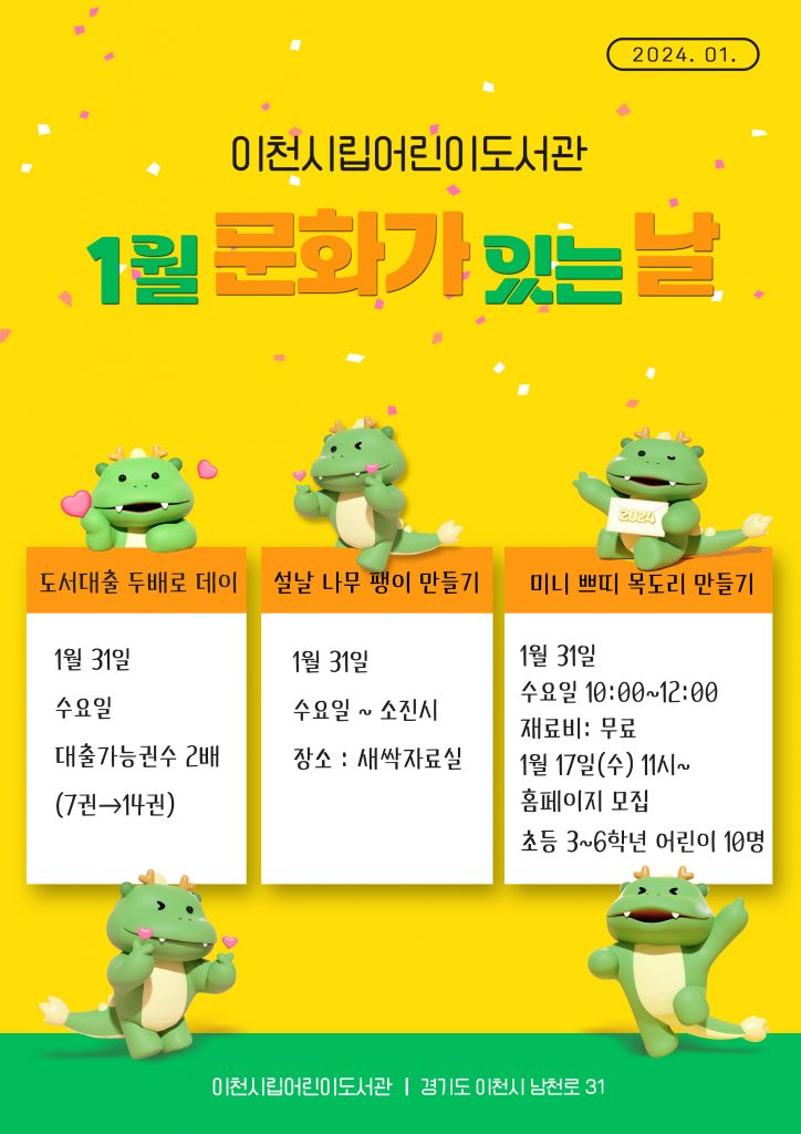 1월 문화가 있는 날에는 1인당 도서 대출 권수가 기존 7권에서 14권까지 확대되는 ▲도서대출 두배로 데이, 고유명절인 설날을 맞아 여러 가지 모양의 팽이를 친구들이 직접 색칠하면서 만들어보는 ▲설날 나무 팽이 만들기, 매듭하는 법과 뜨개질 하는 법을 배우면서 친구들이 직접 목도리를 만들어 보는 ▲미니 쁘띠 목도리 만들기를 진행한다.
