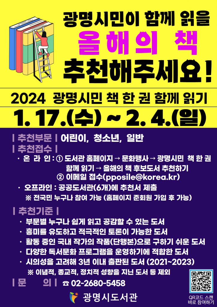 광명시(시장 박승원)는 ‘2024년 광명시민 책 한 권 함께 읽기 사업’ 추진에 앞서 함께 읽을 올해의 책 시민 추천을 오는 2월 4일까지 온오프라인을 통해 신청받는다.