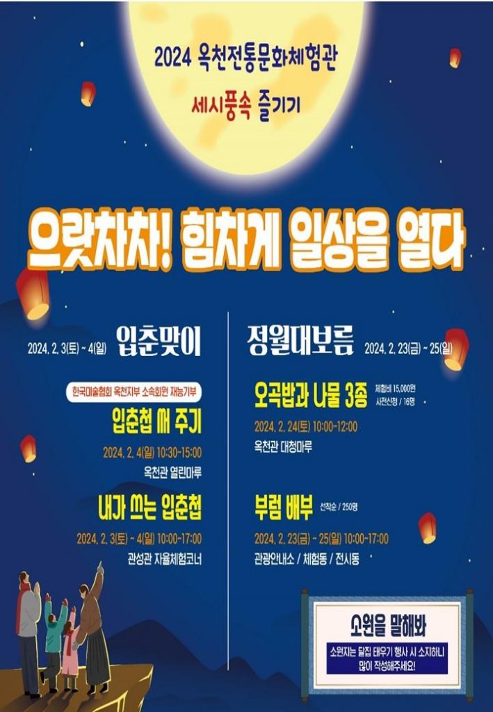 옥천전통문화체험관은 입춘과 정월대보름을 맞이해 2월 4일과 2월 24일 행사를 진행한다고 밝혔다.