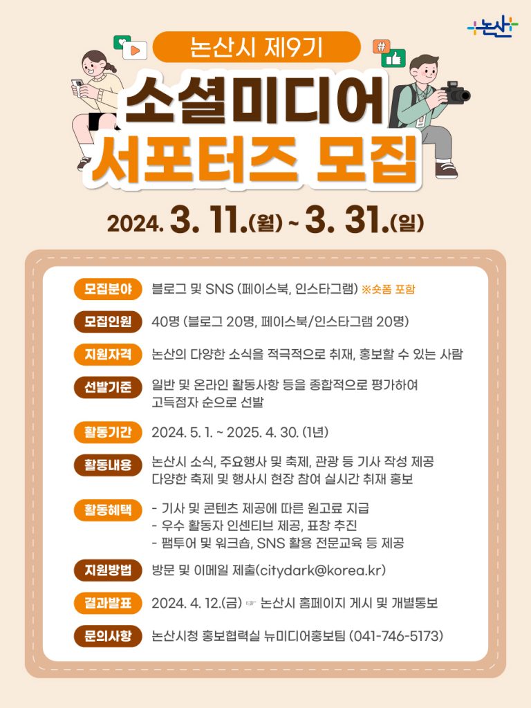 한편, 소셜미디어 서포터즈 모집과 관련한 자세한 사항은 홍보협력실 뉴미디어홍보팀(☏041-746-5173)으로 문의하면 된다.