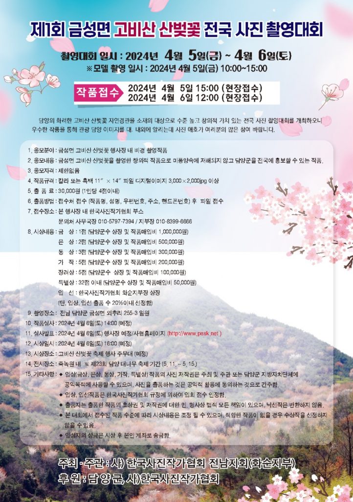 담양군은 화려한 고비산 산벚꽃 자연경관을 널리 알리고, 홍보 자료로 활용하기 위해 제1회 금성면 고비산 산벚꽃 전국 사진 촬영대회를 개최한다.