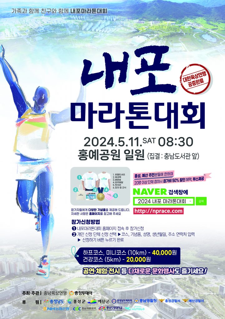 신청은 대회 누리집(http://nprace.com/)에서 할 수 있으며, 인터넷 검색창에 ‘2024 내포마라톤’을 검색하면 쉽게 접속할 수 있다.