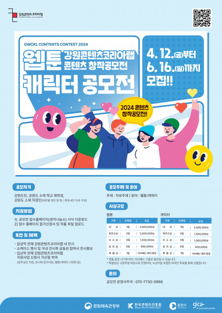 강원정보문화산업진흥원(원장 서병조)은 ‘2024년 강원콘텐츠코리아랩 웹툰, 캐릭터 공모전’을 개최한다고 12일 밝혔다.