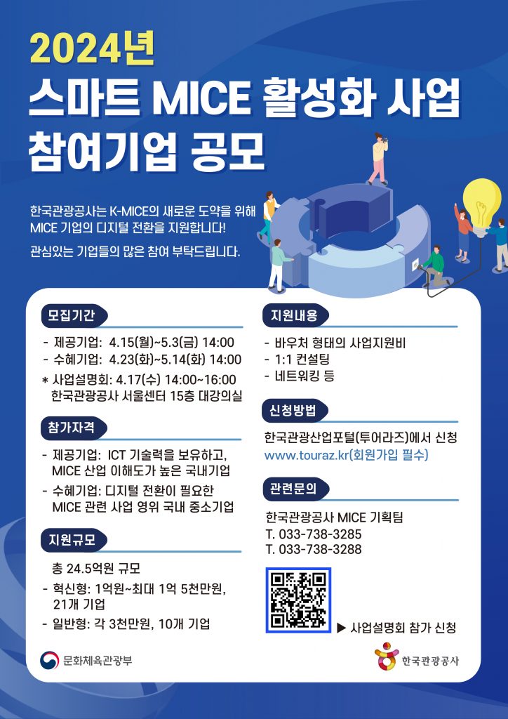 문화체육관광부와 한국관광공사(이하 공사)는 MICE 업계의 지속 가능한 경쟁력 확보를 위해 ‘2024년도 스마트 MICE 활성화 사업’에 참여할 기업을 모집한다.