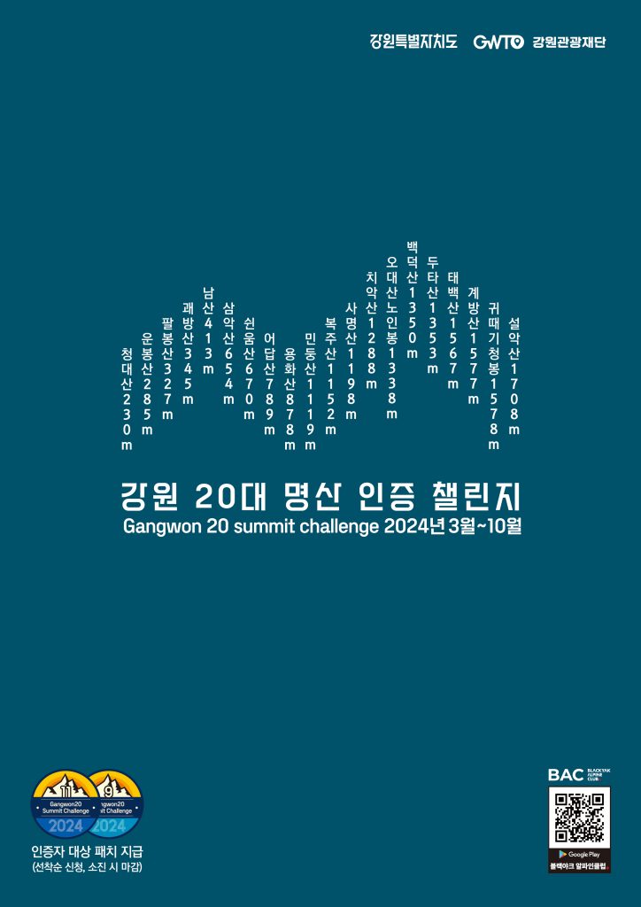 인증 챌린지는 10월까지 진행되며, BAC(블랙야크 알파인 클럽) 애플리케이션을 통해 누구나 참여가 가능하다. 회원가입 후 지정된 명산 정상에 올라 휴대폰 GPS로 인증하고 정상 현장 사진 검증 후 최종 승인되며, 강원 20대 명산에 오를 경우 완등 패치 2종을 받을 수 있다.