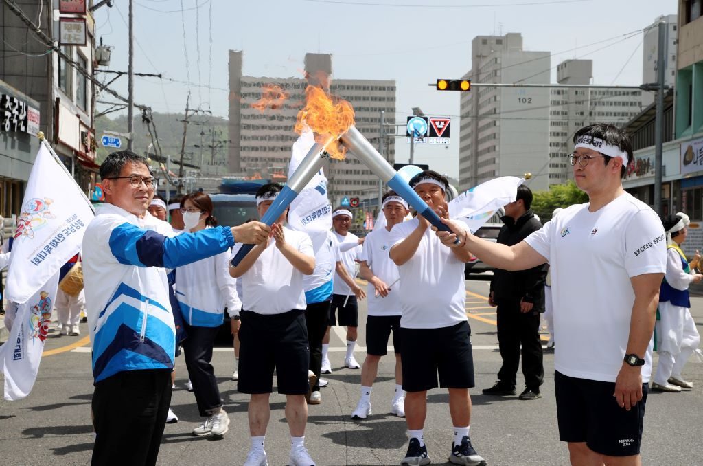 시민들과 풍물패의 열띤 환영 속에 삼랑진읍에 도착한 성화는 가곡동, 상남면, 하남읍 등 16개 읍면동 순회 후 밀양종합운동장 성화대에 점화됐다.