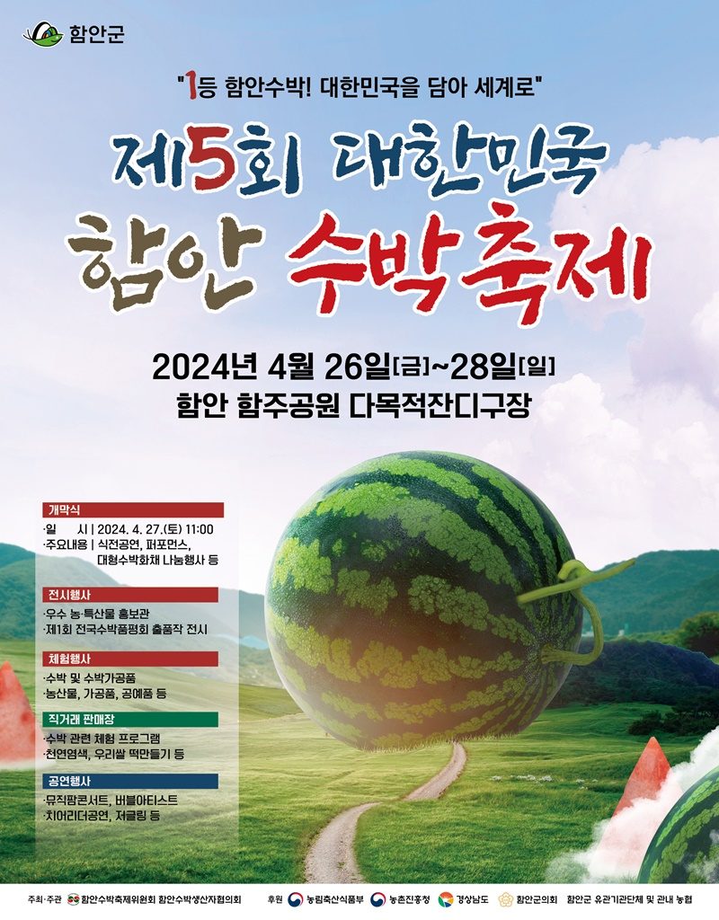 함안군이 주최하는 ‘제5회 대한민국 함안수박축제’가 오는 26일부터 28일까지 3일간 함주공원 다목적 잔디구장 일원에서 열린다.