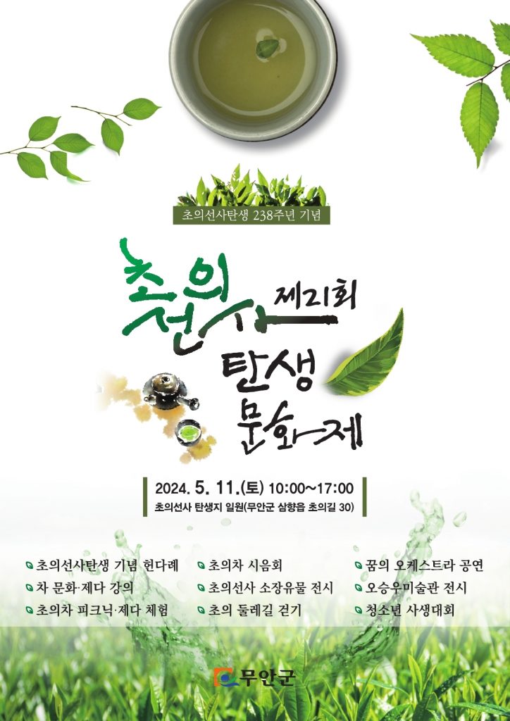 전남 무안군(군수 김산)은 오는 11일 초의선사탄생지 일원에서 초의선사 탄생 제238주년을 기념하는 제21회 초의선사탄생문화제를 개최한다.