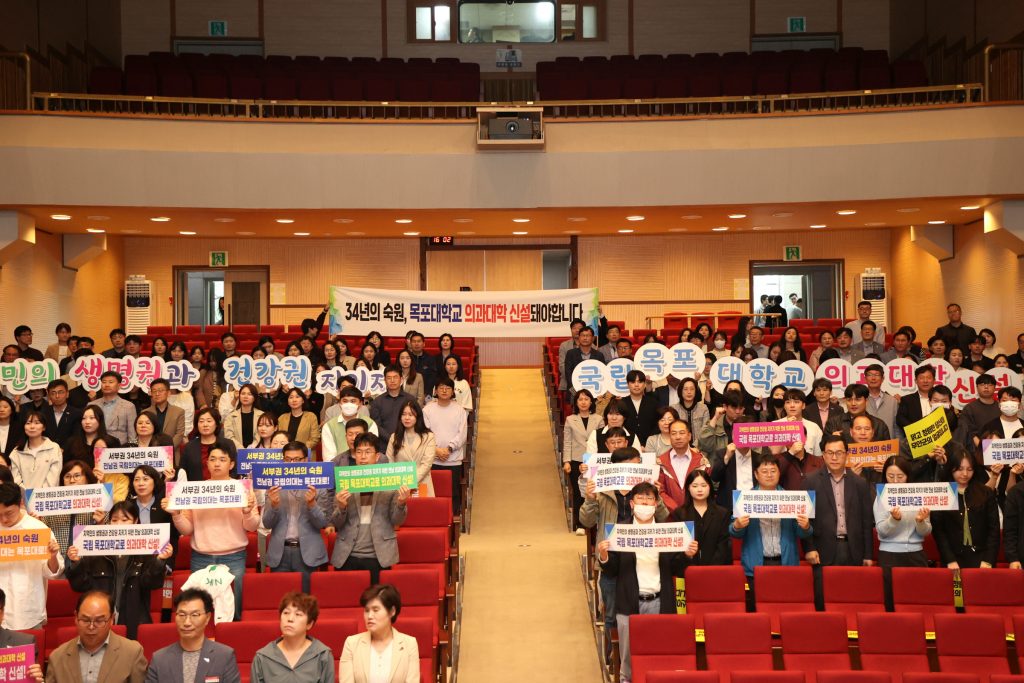 목포대 의대 유치 퍼포먼스에서는 군민의 염원을 담은 피켓과 현수막을 높이 들어 올리고 ‘목포대학교 의과대학 설립 방안을 조속히 확정하라’는 구호를 외침으로써 무안군민의 강력한 의지를 천명하였다.
