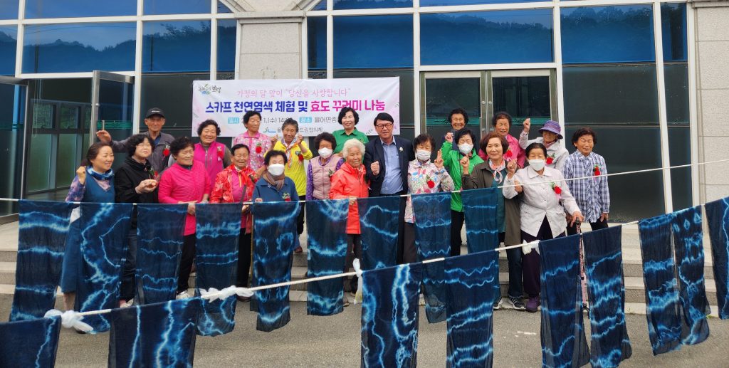 이날 행사를 주관한 율어면희망드림협의체 회원들은 어르신들에게 스카프에 푸른색 쪽물을 들고, 구기며 각기 다른 무늬가 지어지는 이색적인 경험을 선사했다.