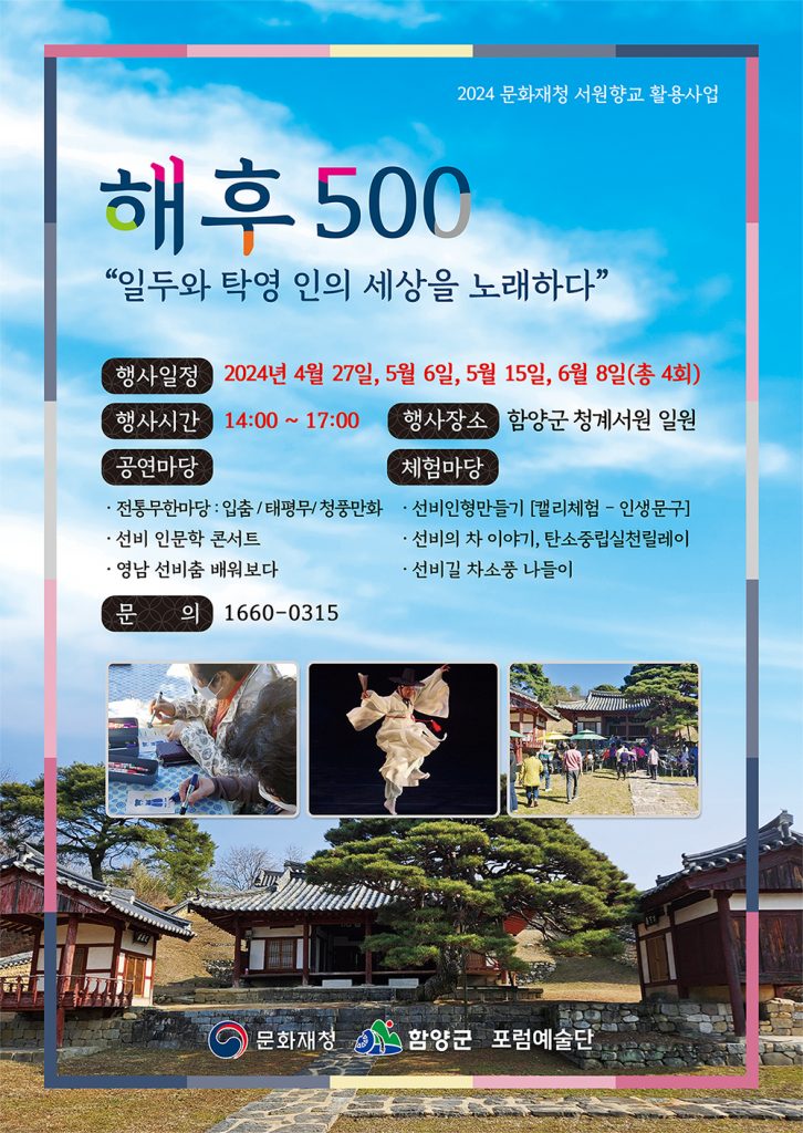 포럼예술단에서 주최하는 ‘해후 500. 일두와 탁영 인의 세상을 노래하다’ 프로그램은 2024 문화재청 서원향교 활용사업으로 선정되어 추진 중인 사업으로, 함양군 청계서원 일원에서 지난 4월 27일을 첫 시작 후 오는 5월 12일과 15일, 6월 8일 등 3차례 진행될 예정이다.
