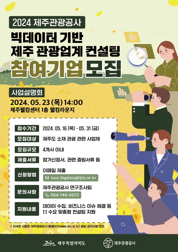 빅데이터 기반 제주 관광업계 컨설팅 참여기업 모집 관련 자세한 사항은 제주관광공사 홈페이지(www.ijto.or.kr) 내 공지사항을 통해 확인할 수 있다.