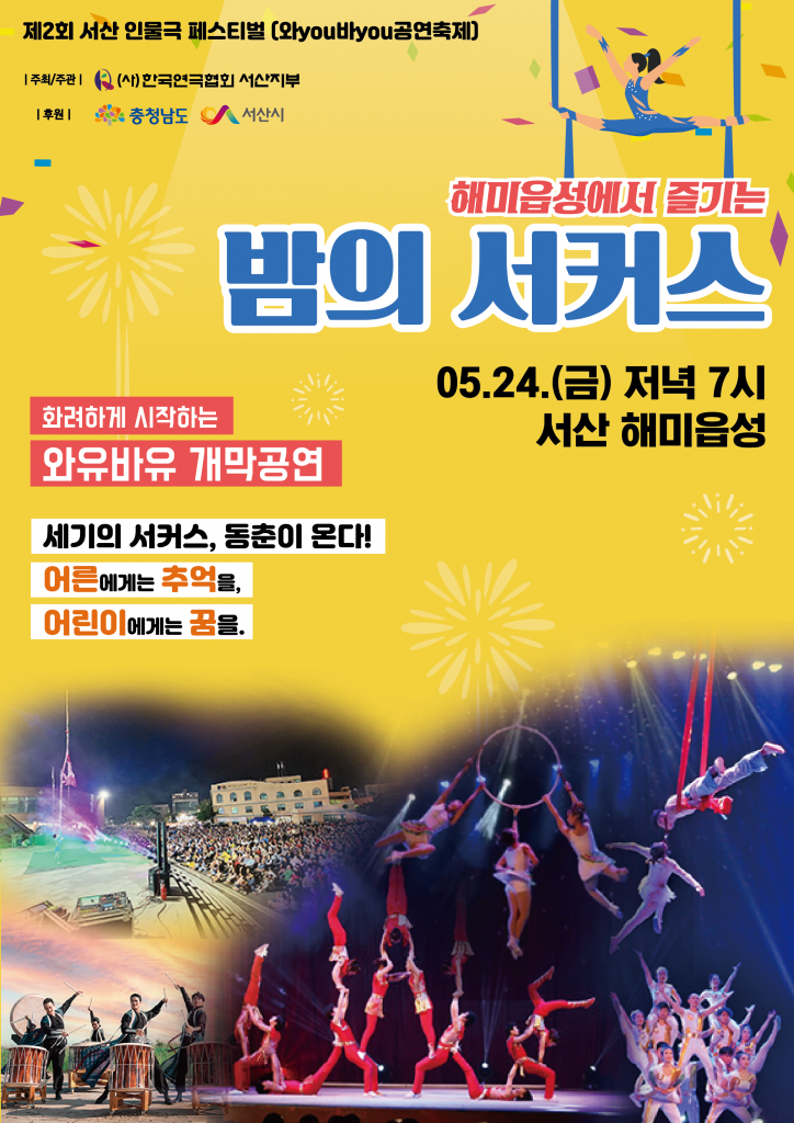 (사)한국연극협회 서산지부가 주최하는 제2회 서산 인물극 페스티벌(와you바you 공연축제)이 오는 24일부터 26일까지 3일에 걸쳐 서산 해미읍성에서 개최된다.