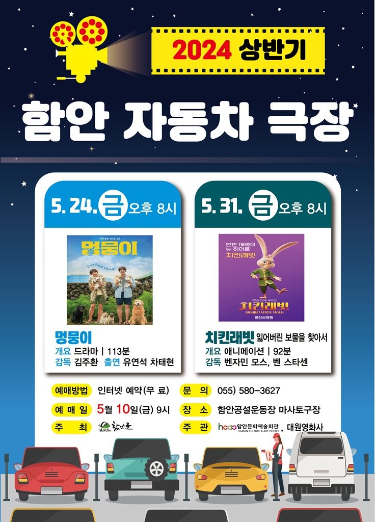 함안문화예술회관은 5월 가정의 달 맞이해 온 가족이 함께 즐길 수 있고 영상 문화 향유 기회를 제공하기 위해 오는 5월 24일, 31일(금) 오후 8시 2회에 걸쳐 함안공설운동장 옆 마사토구장에서 함안 자동차 극장을 운영한다.