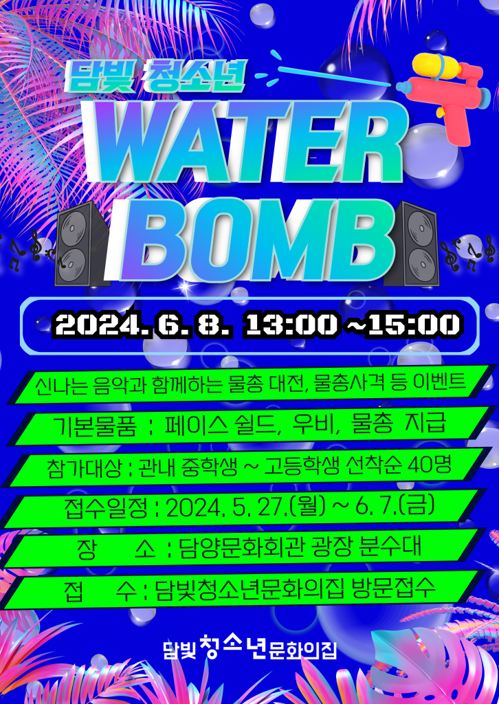 담양군 담빛청소년문화의집은 6월 8일 담양문화회관 광장 분수대에서 담빛 청소년 워터밤 행사를 개최한다고 밝혔다.