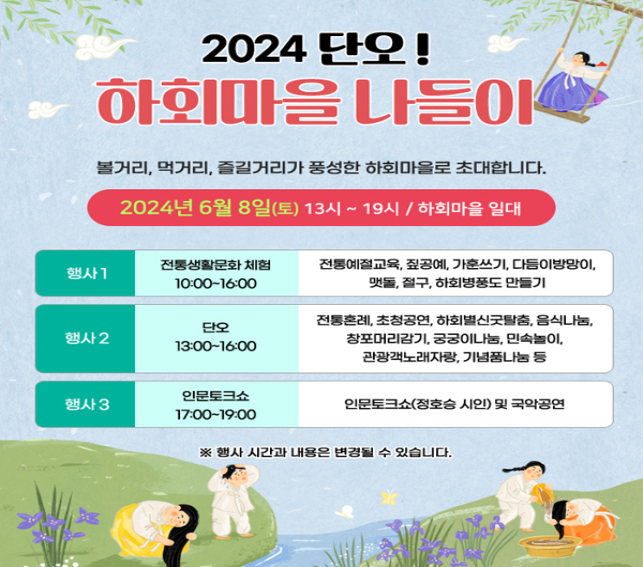 이번 단오 행사는 인류 자산인 세계유산의 가치를 누구나 함께 보고 듣고 체험하고, 널리 전승하고자‘2024년 관광거점도시육성사업’으로 진행되며, 오후 1시 전통혼례를 시작으로 만송정과 부용대를 배경으로 한 인문 토크쇼와 단오 행사 등 다채로운 행사가 진행될 예정이다.