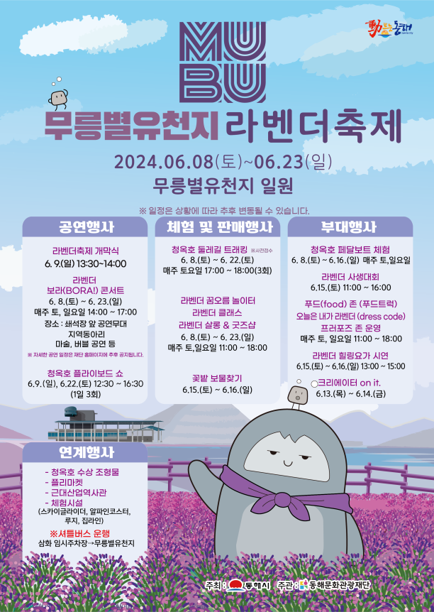 한편 ‘무릉별유천지’는 6월 8일부터 23일까지 라벤더 축제를 개최한다. 올해 2회째를 맞이한 라벤더 축제는 개최 기간을 기존 3일에서 16일로 대폭 늘려 본격적으로 국내외 손님을 맞이한다. 축제 기간에 ▴라벤더를 이용해 향주머니와 부케, 화분을 직접 만들어보는 ‘라벤더 클래스’, ▴에메랄드빛 호수를 가까이에서 즐기는 ‘청옥호 둘레길 트래킹’과 ▴‘페달 카약’ 체험, ▴플라이보드쇼 등 다양한 체험행사와 ▴벼룩시장(플리마켓) ‘라벤더 살롱’, ▴‘보라 콘서트’ 등을 즐길 수 있다.