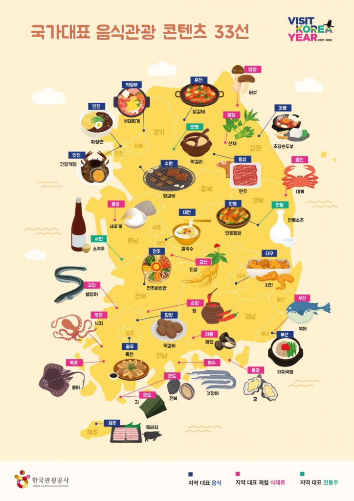 ‘국가대표 음식관광 콘텐츠 33선’은 각 지역을 대표하고 다른 나라와 차별화되는 한국의 음식 콘텐츠를 3개 주제로 나누어 지역 대표 음식(15종), 지역 대표 제철 식재료(15종), 지역 대표 전통주(3종)로 구성했다. 지역 대표 음식은 ▲부산 돼지국밥 ▲광주 육전 ▲수원 왕갈비 등, 지역 대표 제철 식재료는 ▲여수 갯장어 ▲홍성 새조개 ▲하동 재첩 등, 지역 대표 전통주는 ▲안동 소주 ▲양평 막걸리 ▲서천 소곡주가 선정됐다. 33선은 음식관광 산업 내 체계적 육성 잠재력, 시장 타깃별 소구력, 외국인 수용가능성 등을 고려해 외식·관광업계, 학계, 홍보마케팅 분야의 전문가 8인으로 구성된 음식관광 자문회의를 통해 최종 선정됐다.