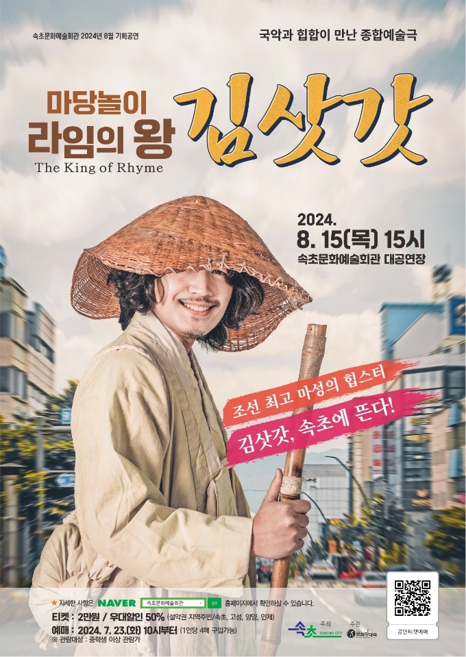 속초문화예술회관의 2024년 기획공연 “마당놀이「라임의 왕 김삿갓」”이 8월 15일 목요일 15시에 공연한다.