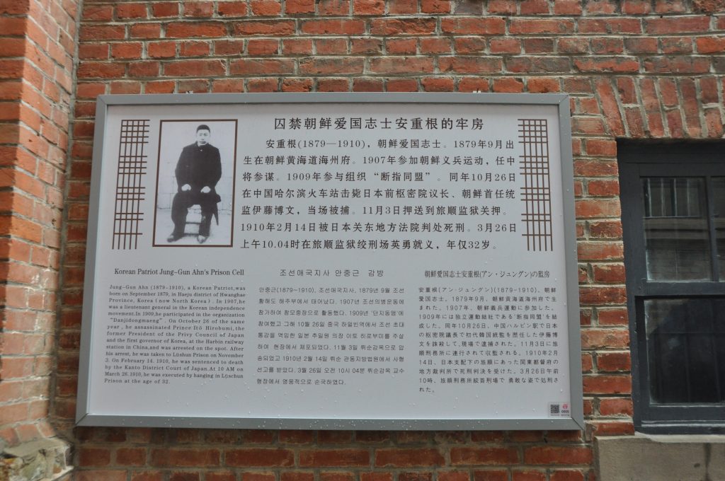 안중근 의사는 1879년 9월 황해도 해주부에서 태어나서 1907년 조선의병운동에 참가해 참모중장으로 활동했고(大韓義軍參謀中將 安中根), 1909년 단지동맹에 참여하다가 그해 10월 26일 하얼빈에서 이토 히로부미를 살해하고 현장에서 러시아 헌병에 체포돼다. 안 의사는 일본으로 이첩된 후 11월 3일 이곳 뤼순감옥으로 압송됐으며, 다음 해 1910년 2월 14일 뤼순관동지방법원에서 사형선고를 받고, 3월 26일 오전 10시 4분 뤼순감옥의 교수형장에서 순국했다. 이곳에서 교수형으로 처형된 시신들은 원통에 넣어 주변 야산에 매장했다. 일본이 패망하기 직전 1942년부터 1945년 8월까지 항일운동을 했던 약 700여명의 중국인과 한국인들의 사형을 집행했다는 기록이다.