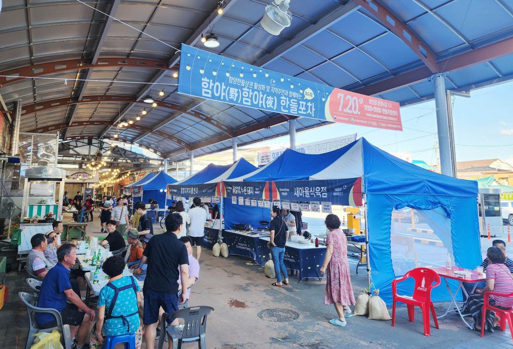 ‘함야(野) 함야(夜) 한들포차‘는 지난 7월 20일(토요일) 오후 5시부터 9시까지 ‘함양떡방앗간’ 앞에서 문을 열었다. 장날이 아닌 주말 저녁 지리산함양시장은 야시장 ‘함야(野) 함야(夜) 한들포차’를 방문한 지역민들로 북적였다.