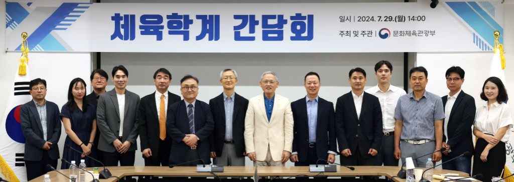 문화체육관광부(이하 문체부) 유인촌 장관은 7월 29일(월) 오후, 국립현대미술관 서울관에서 스포츠 정책, 스포츠 과학, 스포츠 법령에 이르는 다양한 분야의 체육학계 교수 9명을 만나 한국 스포츠의 발전을 위한 정책 과제를 논의했다. 이번 간담회는 ‘2024 파리올림픽’을 계기로 거론되고 있는 한국 엘리트 스포츠 위기론을 극복하는 방안을 함께 강구하고, 학계 현장의 의견을 폭넓게 수렴하고자 마련한 자리이다.