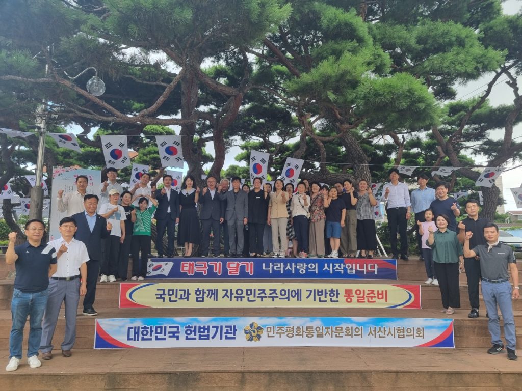 민주평화통일자문회의 서산시협의회(회장 이규현)는 2024. 8. 1.(목) 오전8시, 시청앞 솔빛공원에서 자문위원, 박노수 서산시 자치행정국장과 관내 북한이탈주민 등 50여명이 함께 79주년 광복절에 즈음하여 나라사랑·평화통일 캠페인으로‘광복절 맞이 태극기 동산’조성 활동을 펼쳤다.
