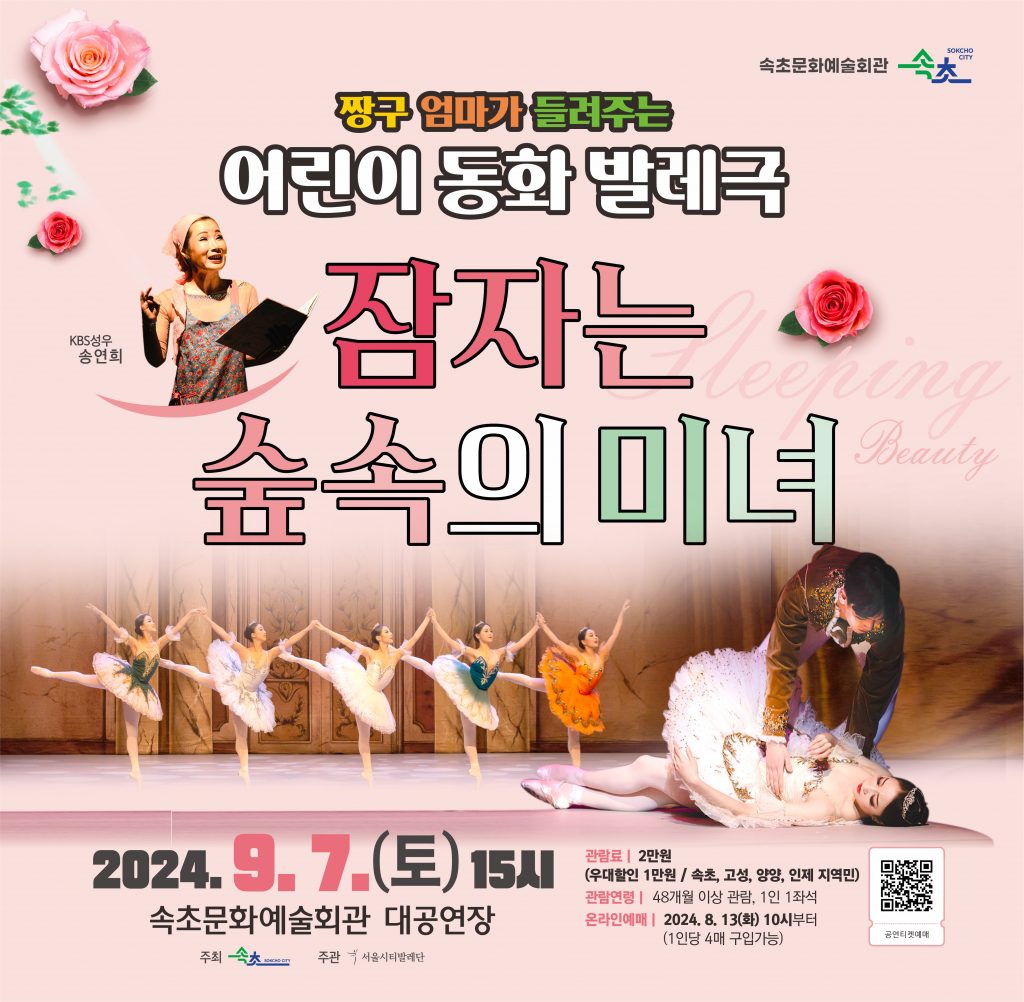 속초문화예술회관 9월 기획공연 “짱구 엄마가 들려주는 어린이를 위한 동화 발레 「잠자는 숲속의 미녀」”가 오는 9월 7일 오후 3시에 속초문화예술회관 대공연장에서 진행된다.