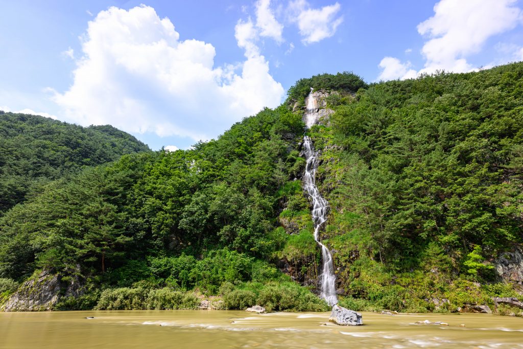 백석폭포는 장마철 수량이 증가하면 물살이 더욱 선명해 한 폭의 그림과 같은 절경으로 관광객의 시선을 사로잡는다.