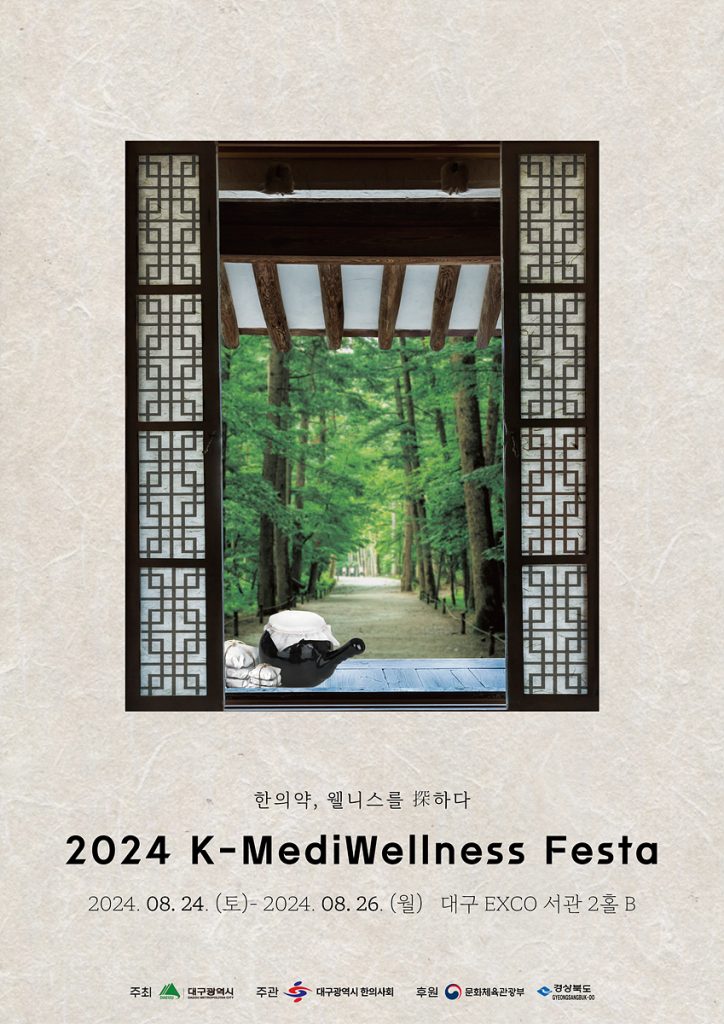 대구광역시는 오는 8월 24일(토) ~ 26일(월) 3일간, 대구광역시 한의사회(회장 노희목) 주관, 문화체육관광부와 경상북도 후원으로 대구 엑스코 서관 2홀 B에서 ‘한의약, 웰니스를 探(탐)하다’를 주제로 ‘2024 K-MediWellness Festa(케이-메디웰니스 페스타)’를 개최한다.