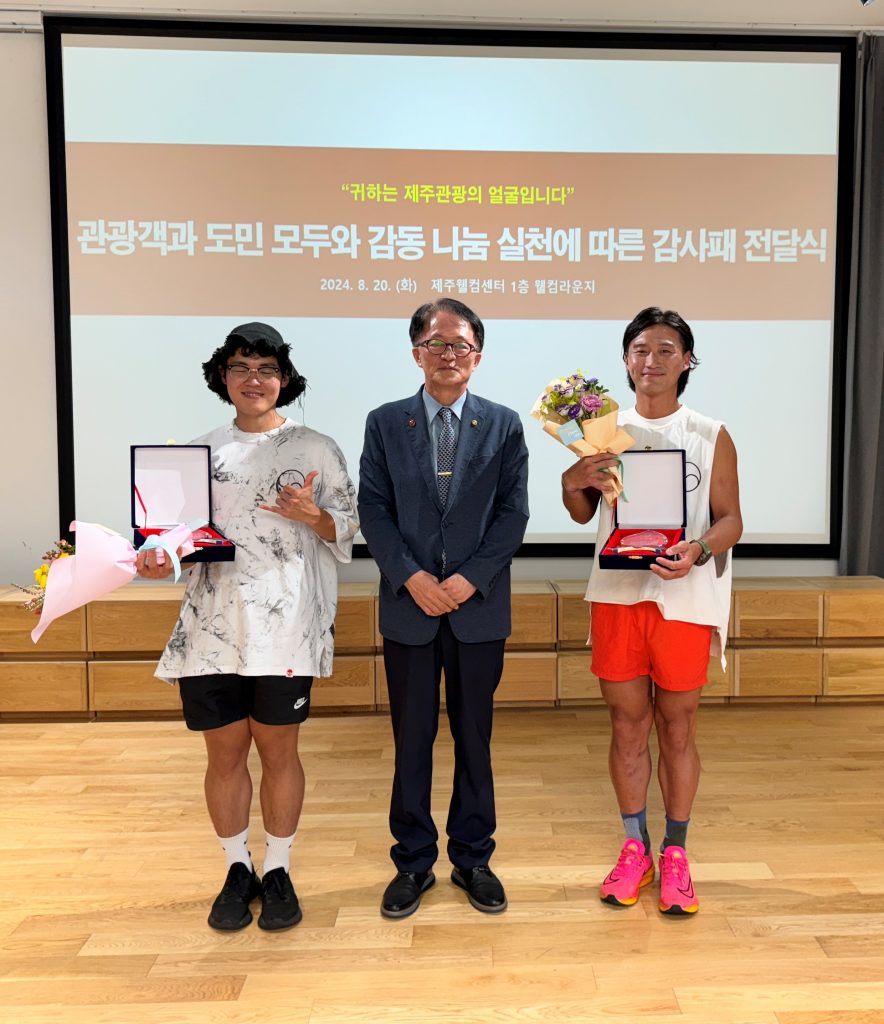이에, 제주관광공사는 뜻깊은 선행으로 제주 이미지 개선에 기여한 부분을 높이 평가, 지난 20일 조신홍씨와 곽용준씨에게 감사패를 전달했다.