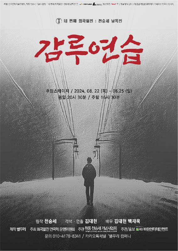 ‘네 번째 희곡열전은 천승세 작가전’ 참가 예술단체 극단 ‘별무리’의 낭독극 ‘감루연습은 8월22일부터 25일까지 이며 목,금 오후8시30분 / 토,일 4시30분 이고 대학로 후암 스테이지에서 공연한다. 예매는 인타파크 티켓에서 가능하다