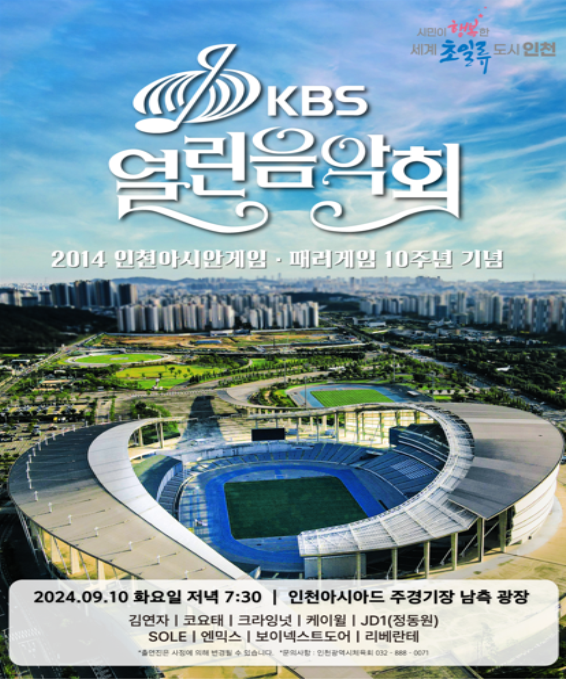인천광역시는 오는 9월 10일 오후 7시 30분 인천아시아드주경기장 남측광장에서‘2014 인천아시안게임․패러게임 10주년’을 기념하기 위한 ‘KBS 열린음악회’를 개최한다고 밝혔다.