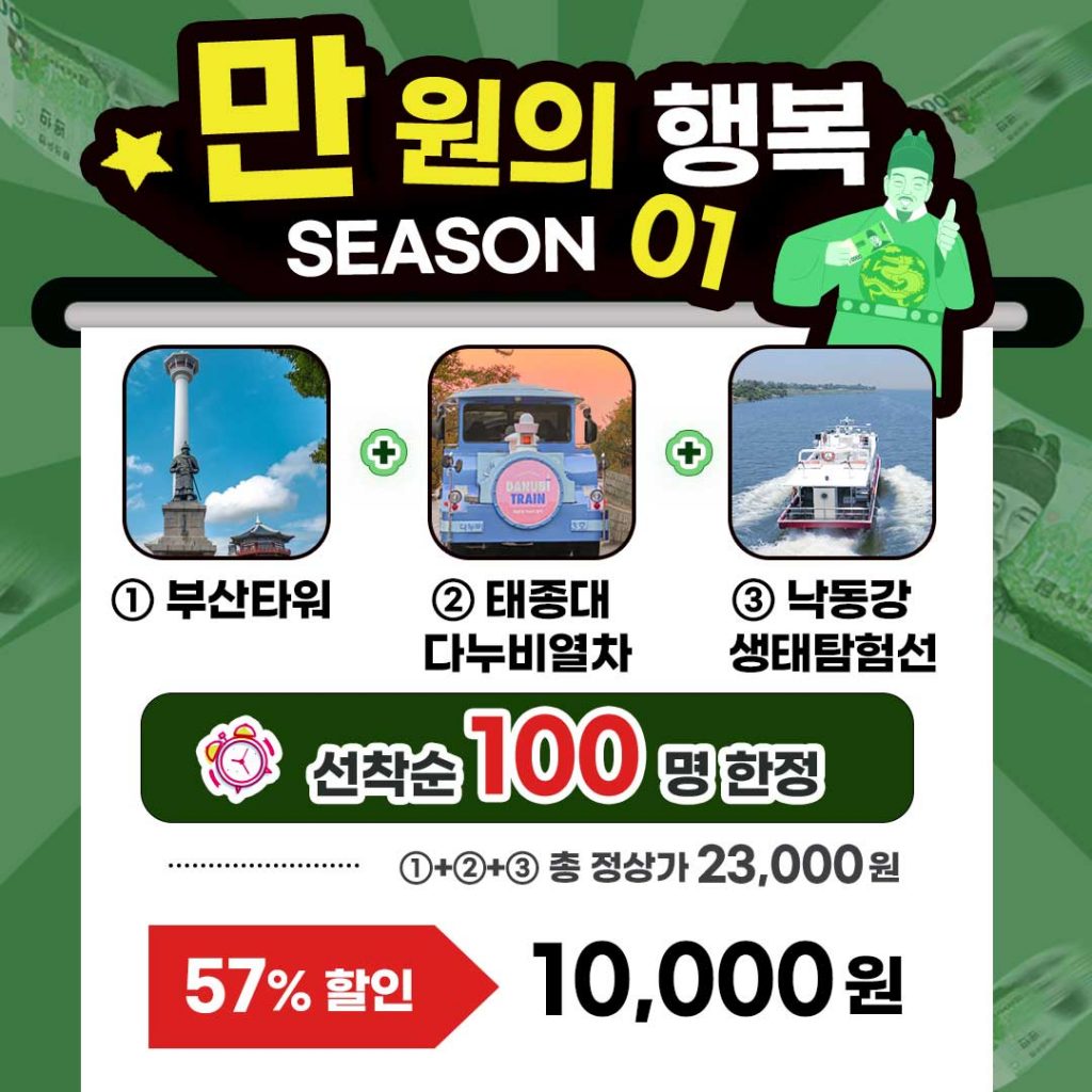 추석을 맞이하여 판매되는 만원의 행복 여행상품은 한국관광 100선에 6회 연속 선정된 ▲태종대 다누비열차 탑승권과 부산 원도심의 대표 관광지인 ▲부산타워 관람권, 서부산의 생태관광을 체험할 수 있는 ▲낙동강생태탐방선의 승선권이 포함되어 있으며 10월 31일까지 이용할 수 있다.