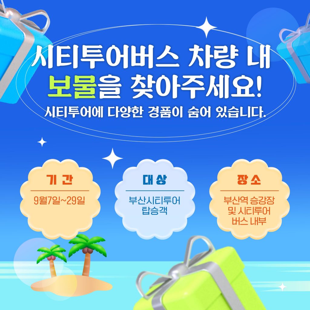 이벤트 참여 방법은 부산시티투어버스를 이용하는 누구나 참여할 수 있으며, 버스 내 숨겨진 보물을 찾기만 하면 된다. 행사는 시티투어버스 운행회차 중 랜덤 방식으로 하루 2회로 총 80명을 대상으로 진행된다. 주요 경품으로는 ▲윈덤그랜드부산 스위트룸 이용권(150만원 상당) 과 ▲런치 및 디너 식사권, ▲시티투어 여행용 파우치 등이 준비되어 있으며 이벤트 기간 동안 총 1,480명에게 제공될 예정이다.