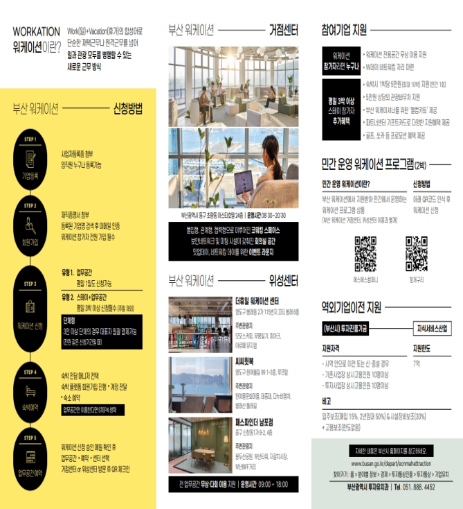이번 협력으로 서울시 소재 중소기업 근로자는 부산형 휴가지 원격근무(워케이션)에 참여함으로써 ▲숙박시설 및 업무공간 이용 ▲교류(네트워킹) 행사 등을 활용한 지역 내 신생기업(스타트업), 관광기업 및 소상공인 간의 사업(비즈니스) 협업 관계 형성 ▲관광·문화 상품 체험 ▲기본 숙박지원금 외 추가 지원을 받을 수 있다.