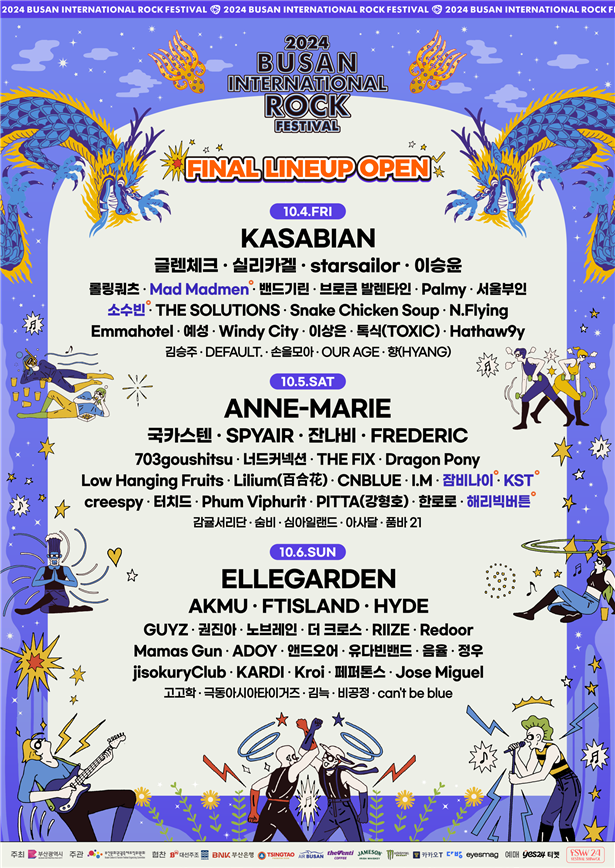 부산시(시장 박형준)는 국내 최장수 록 음악 페스티벌 「2024 부산국제록페스티벌」의 최종 출연진을 공개한다고 밝혔다.오는 10월 4일부터 6일, 3일간 삼락생태공원에서 열리는 이번 축제에는 총 78팀의 아티스트가 출연할 예정이다.