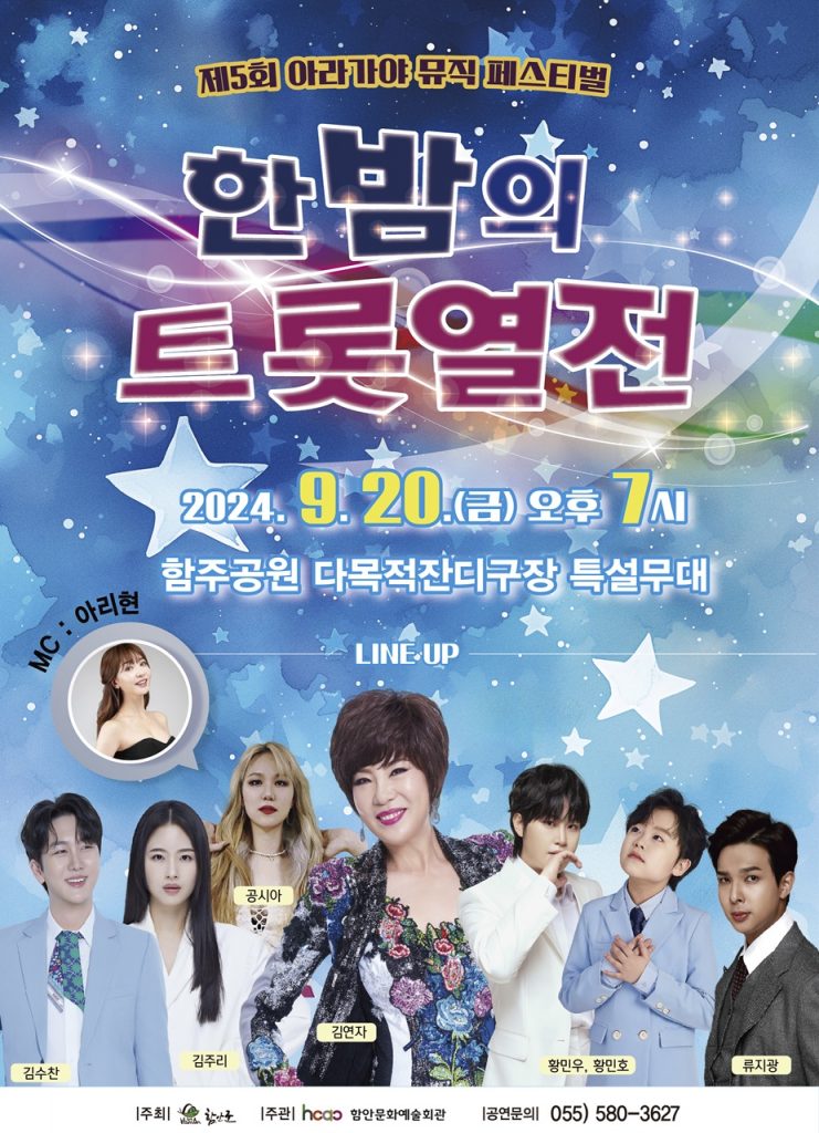 함안문화예술회관은 오는 20일(금) 오후 7시 함안실내체육관에서 제5회 아라가야 뮤직 페스티벌 ‘한밤의 트롯열전’을 개최한다. 당초 공연은 함주공원 다목적잔디구장 특설무대에서 진행할 예정이었으나, 우천 예보로 함안실내체육관으로 변경됐다.