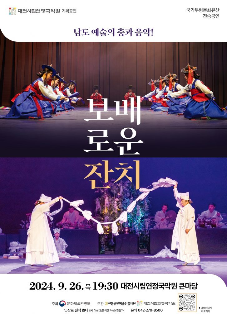 대전시립연정국악원(이하 국악원)은 문화체육관광부가 주최하고 (재)전통공연예술진흥재단이 주관하는‘2024 전국풍류자랑’에서 우수작으로 선정된 <남도예술의 춤과 음악! 보배로운 잔치>를 26일 오후 7시 30분 국악원 큰마당에 올린다.