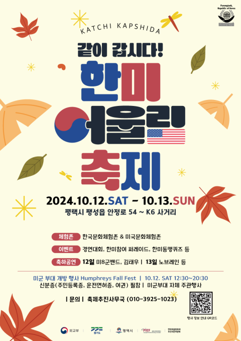 이번 행사는 12일(토)에 예정된 캠프 험프리스 미군기지 개방행사(Fall Fest)와 함께 다양한 공연, 체험 등 프로그램들로 구성돼 한미 문화교류의 장을 만드는 축제며, 평택시 팽성읍 안정로 일원(K-6 밀렛 게이트 앞~다솜요양병원 사거리)에서 오후 1시부터 9시까지 진행될 예정이다.