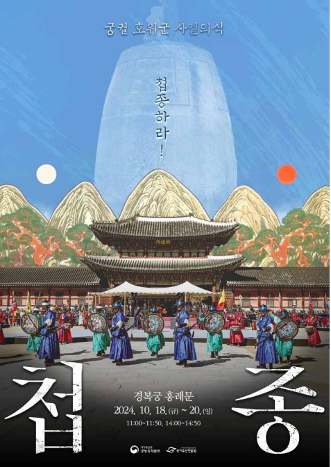 국가유산청 궁능유적본부(본부장 이재필)는 국가유산진흥원(원장 최영창)과 10월 18일부터 20일까지 3일간 하루 2회(오전 11시, 오후 2시) 경복궁 흥례문 앞(서울 종로구)에서 <2024년 궁궐 호위군 사열의식 ‘첩종(疊鐘)’> 행사를 개최한다.